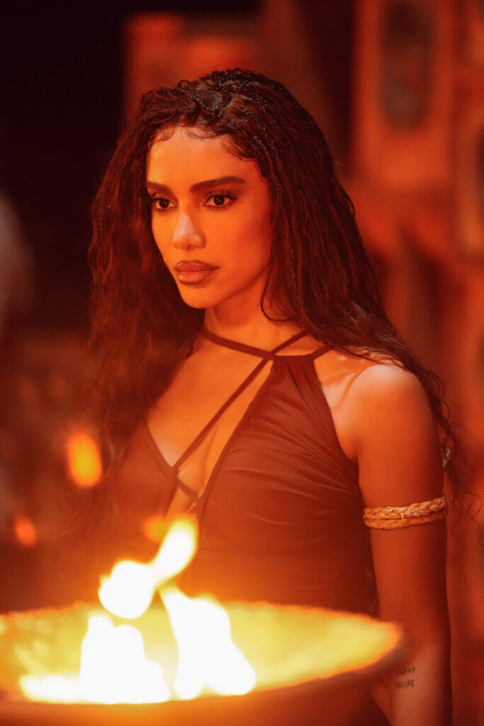 A produção destaca imagens simbólicas. Um círculo de atabaques envolve um paredão que surge da terra, enquanto alguidares em chamas reforçam a atmosfera espiritual e de proteção.
