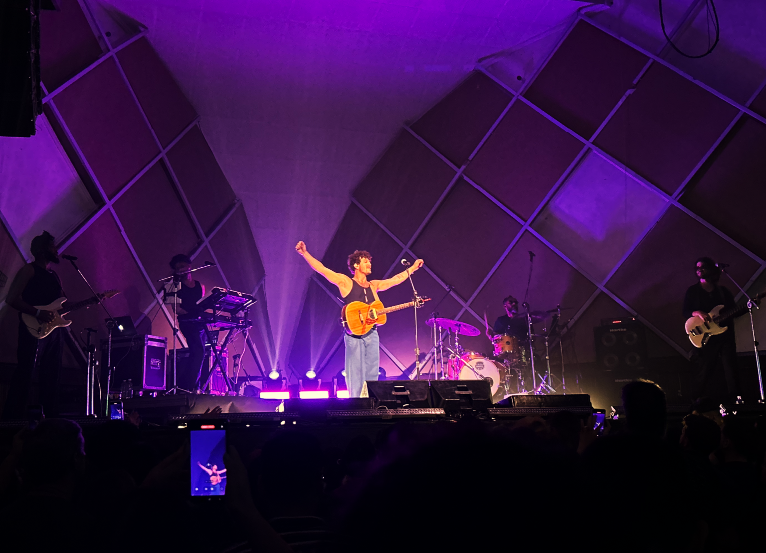 O cantor demonstra seu multitalento no palco, sem soltar o violão do corpo, além de momentos acústicos e até mesmo com gaita.