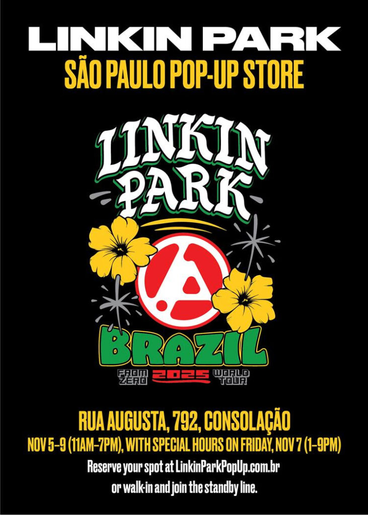 O Linkin Park volta a movimentar São Paulo com uma novidade especial para os fãs. Antes do aguardado show no Estádio MorumBIS, marcado para o dia 8 de novembro, a banda reabre sua Pop-Up Store na cidade. O espaço temporário funcionará no E-Lab, localizado na Rua Augusta, 792 – Consolação, entre os dias 5 e 9 de novembro.