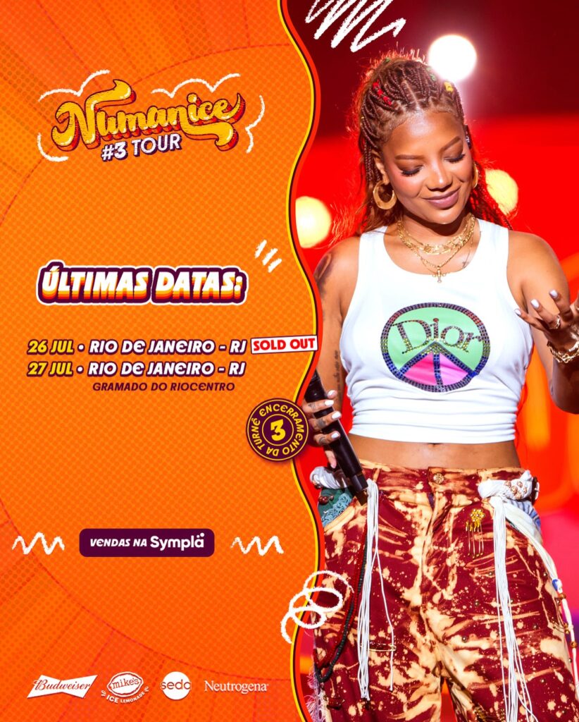 O fenômeno “Numanice”, idealizado por Ludmilla, se despede dos palcos com duas apresentações especiais no Gramado do Riocentro, nos dias 26 e 27 de julho, no Rio de Janeiro. Os shows marcam o encerramento da terceira edição da turnê, que percorreu o Brasil e o exterior com recordes de público e engajamento — com ingressos esgotados para a primeira data e uma sessão extra aberta para atender a forte demanda.