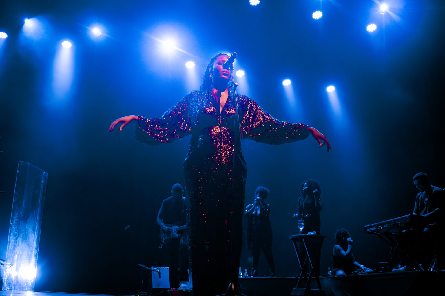 Luedji, totalmente à vontade e descalça no palco, rapidamente se mostrou a melhor pessoa para apresentar esse tão sonhado repertório de Sade. Nesse caminho, ela equilibra sua aura divina com a busca de conexão intensa com o público. Dessa vez, desceu do palco durante uma música inteira, passeou pela grade e cantou olhando no olho de cada um.