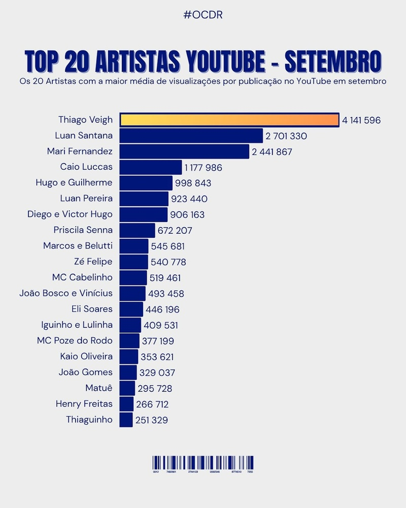 O rapper Veigh alcançou um feito histórico ao se tornar o artista mais assistido do YouTube Brasil em setembro, segundo dados da Zeeng BR. Com uma média superior a 4 milhões de visualizações por publicação, ele superou nomes consagrados da música nacional como Luan Santana e Mari Fernandez, consolidando sua posição como um dos principais nomes da nova geração do rap brasileiro.